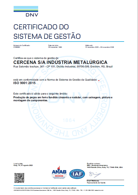 Com mais de 60 anos de história, a Cercena S.A. Indústria Metalúrgica, sediada em Erechim (RS), é referência nacional e internacional em fundição de ferro nodular e cinzento. Atuando com usinagem, pintura e montagem de conjuntos.